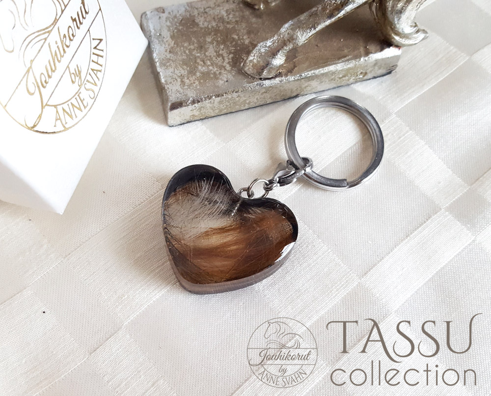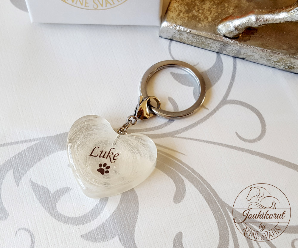 Avaimenperä tai koriste laukkuun tms. jossa sisällä lemmikin karvoja sekä nimi. Ihana muisto rakkaasta koirasta, kissasta tai muusta karvaisesta perheenjäsenestä.