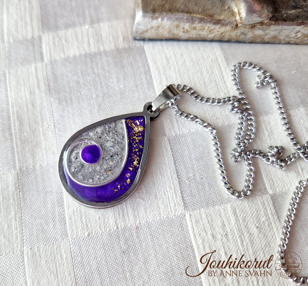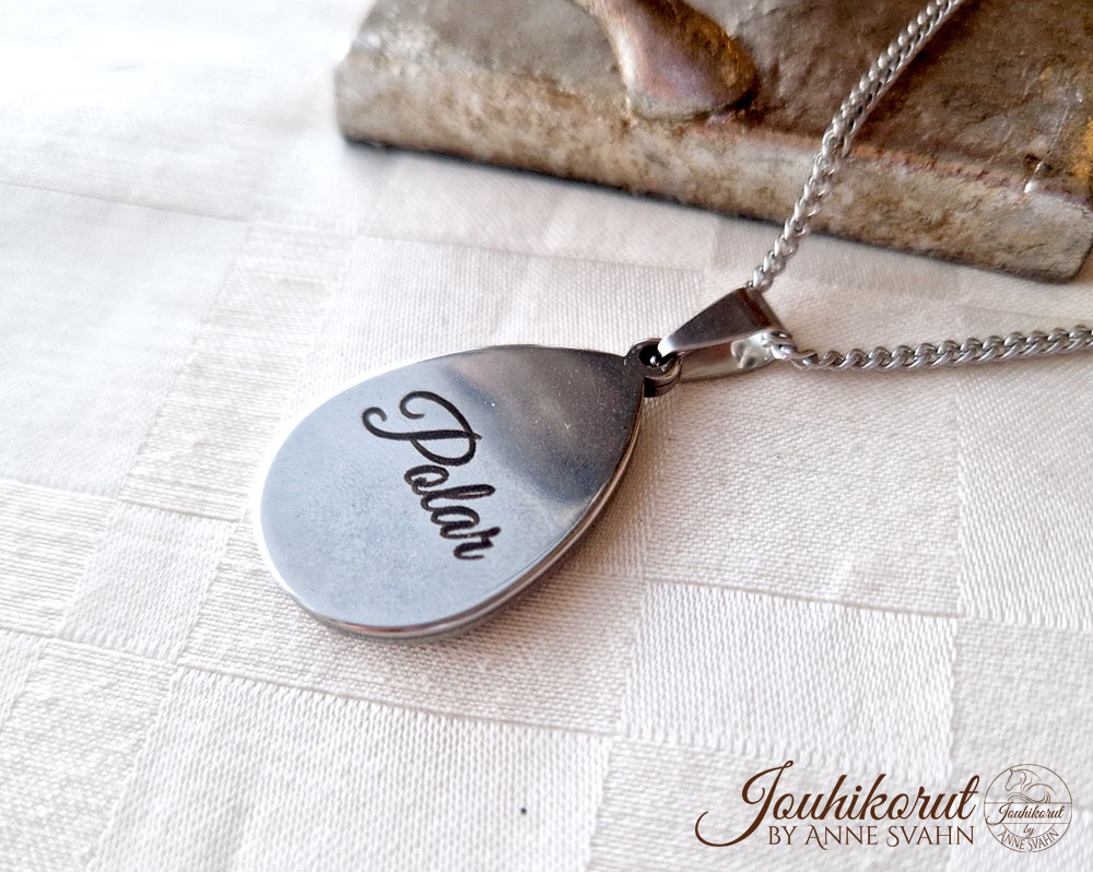 Todella kaunis muistokoru lemmikin tuhkasta! Riipuksen taakse saat halutessasi kaiverruksen. Metalliosat ruostumatonta terästä.
