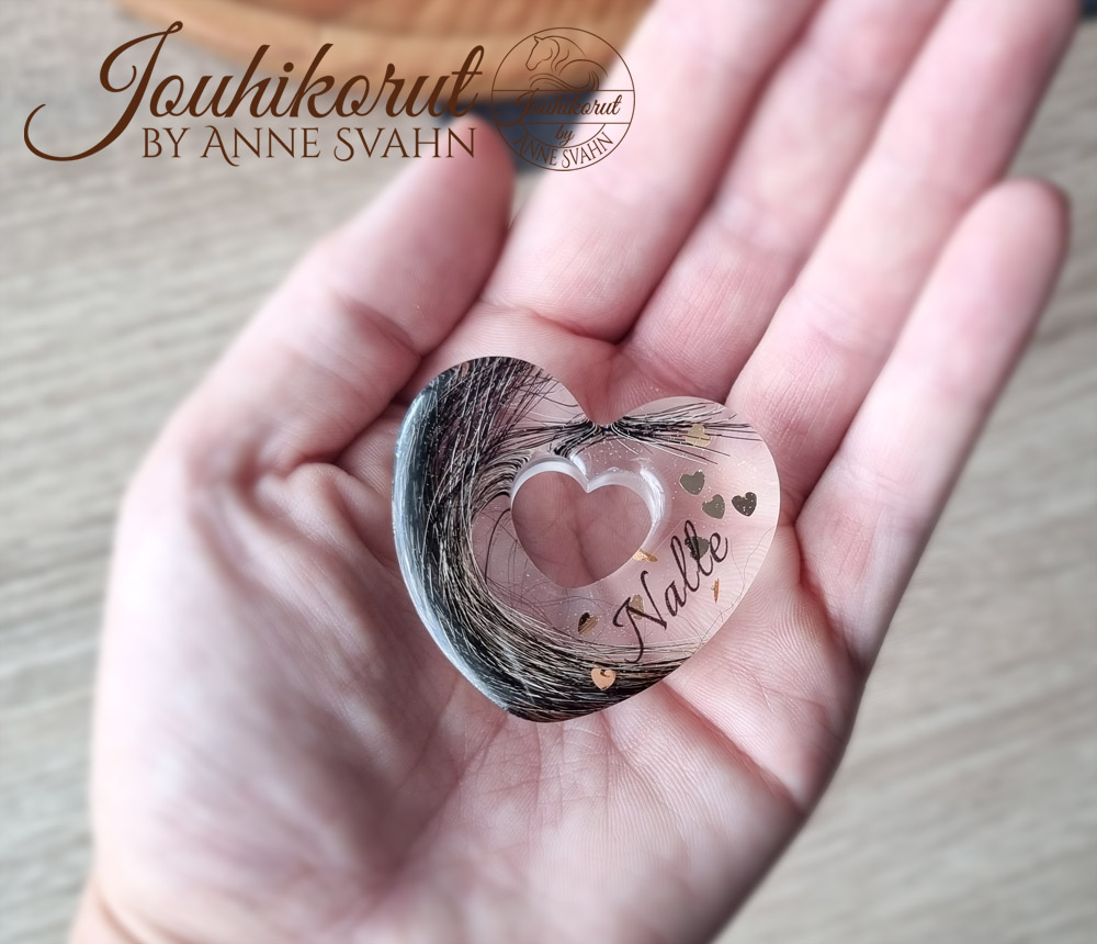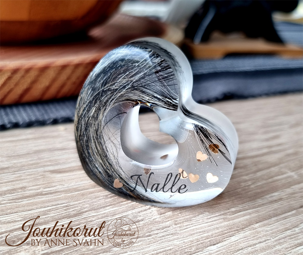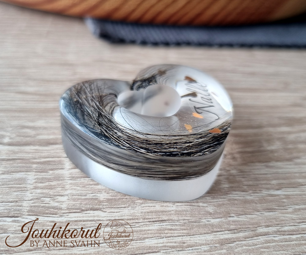 Upea pöytäkoriste rakkaan lemmikin muistoksi. Sydämen sisällä karvoja sekä pieniä kultaisia sydämiä ja nimi (ei pakollisia). Voidaan pitää esim. pöydällä tai hyllyllä.